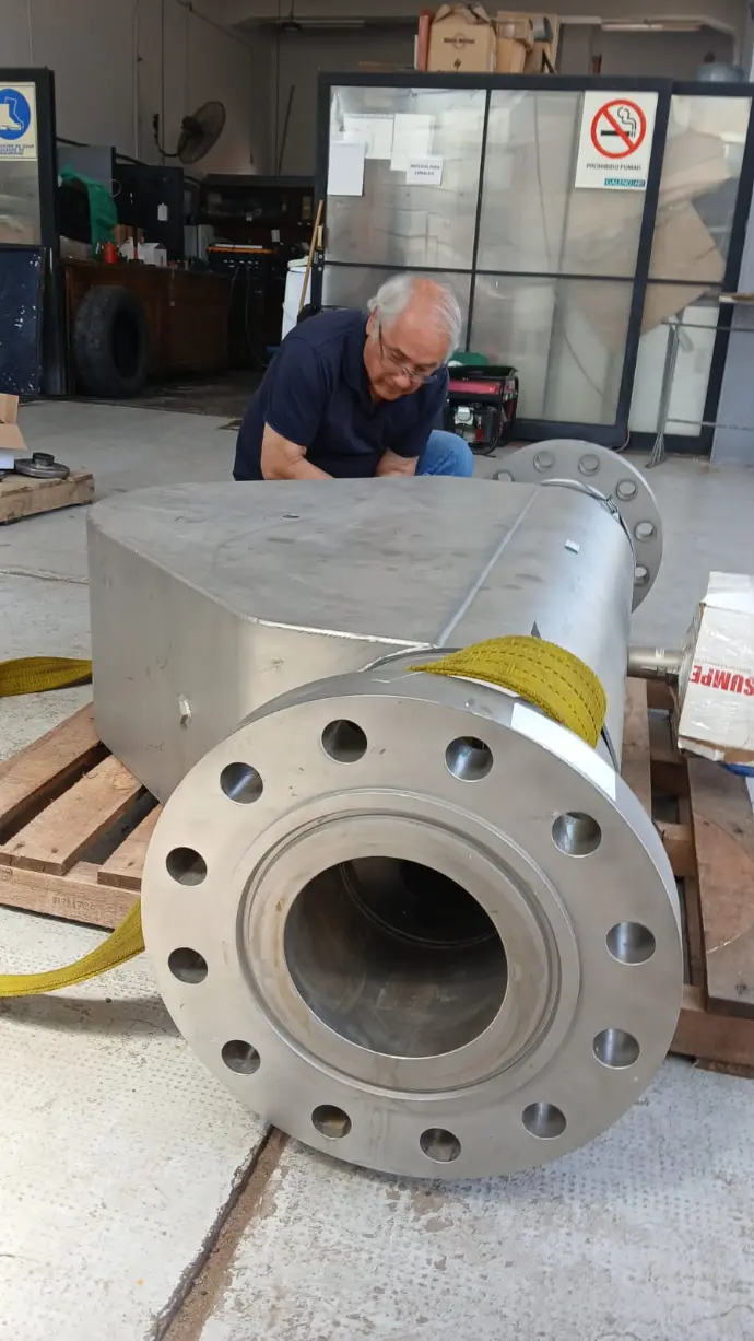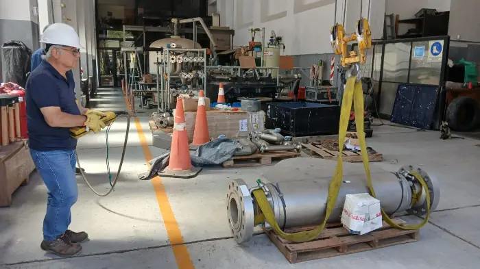 El desafío técnico fue considerable: el sensor presentaba un peso de 500 kg, una longitud cercana a los dos metros y extremos con bridas de 8” serie 900. Estas dimensiones demandaron una adecuación especial del banco de ensayo, junto con un proceso de limpieza y preparación cuidadosamente planificado para garantizar la integridad del equipo y la seguridad del procedimiento.